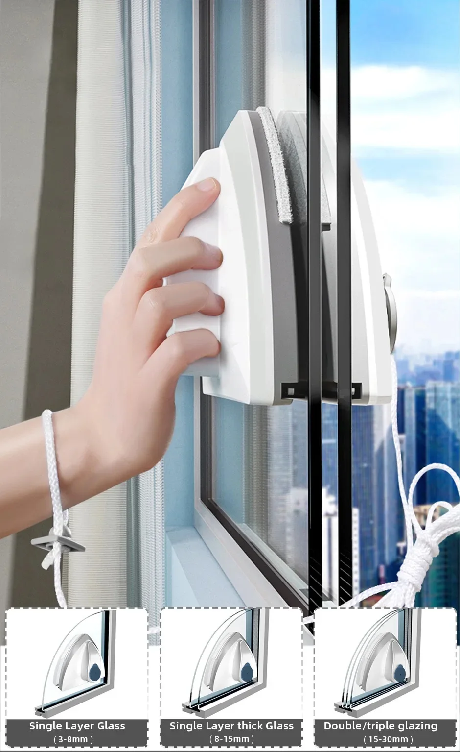 The Double-Sided Magnetic Window Cleaner locks through the glass using a strong magnet. Clean the inside โ the outside cleans itself at the same time.